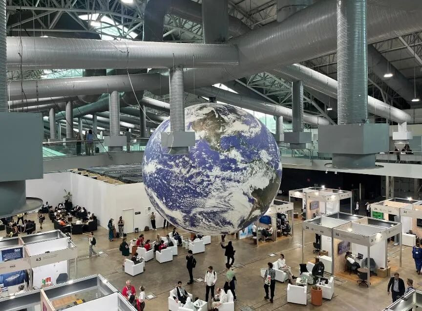 边会场馆中间悬挂着一个巨型地球。这座在贝伦城市公园中临时搭建的场馆,通风与空调设施简易